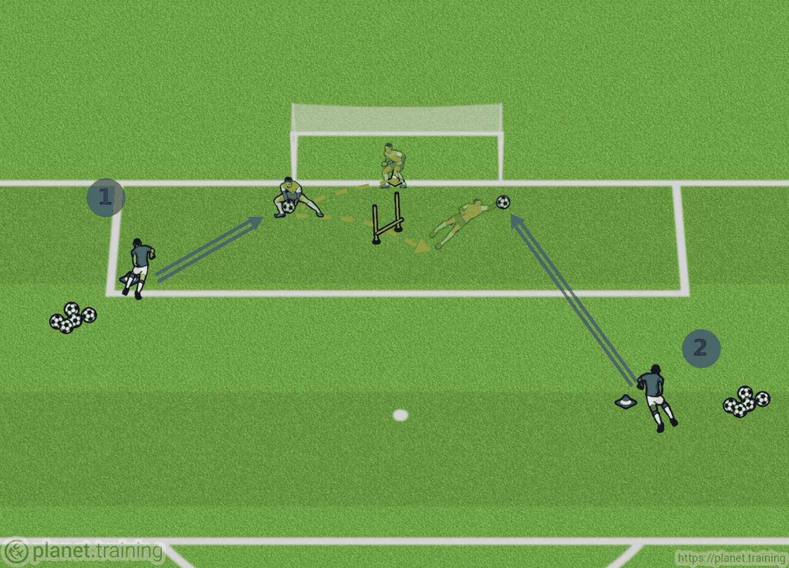Am seitlichen Rand des Strafraums, die Stationen 1 & 2 mit je einem Hütchen & mehreren Bällen aufbauen - ein Spieler an jede Station. 1 Tor ca. 30m vor der Torlinie aufstellen - auch durch Anspieler ersetzbar. Auf der Torlinie werden 3 kleine Hürden platziert - Startpunkt für Torhüter links oder rechts davon.